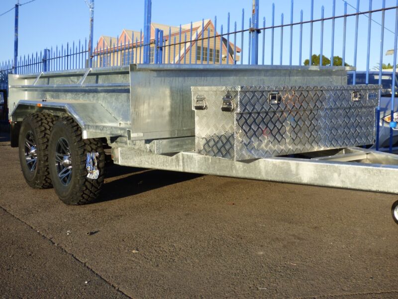 HYDRAULIC 10X6 HIGH SIDED BOX TIPPER TRAILER.6 TON HYDRAULIC RAM 70MM TOWBALL LANDCRUISER MAGS AND LT TYRES.6 STAGE RAM SWINGING REAR TAILGATE .THIS TRAILER IS MADE FROM 3MM PLATE STEEL AND HEAVY DUTY TWIN BOX TUBE CHASSIS.DIPPED IN ADELAIDE TO HIGHEST STANDARD GALVANISING.(NOT LIKE IMPORTED DIPPED PRODUCTS USING INFERIOR STEEL) AUSTRALIAN MADE BUILT TO LAST.IN HOUSE REGISTRATION AVAILABLE FOR YOUR CONVENIENCE. WE ALSO HAVE MANY DIFFERENT MODELS OF TIPPER TRAILER AVAILABLE ALL AUSTRALIAN MADE STARTING AT $4990.